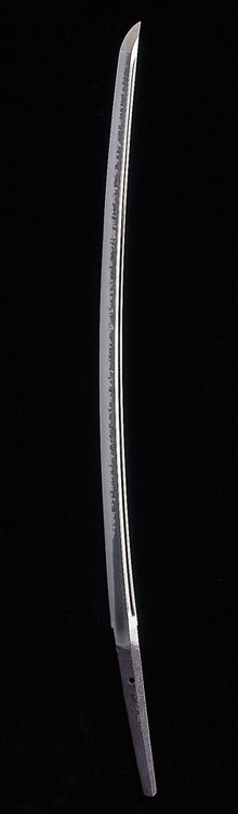 大阪石堂。多々良四郎兵衛。一文字風の大房丁子を見事に焼き大阪石堂の代表工である。地鉄は板目のよく詰んだものと肌立つものがある。 この時代備前伝一文字風大房丁子は長幸か光平かとも言われている。 この刀は備前伝見事な造り込みで、腰の開いた乱に丁子乱まじり鋩子はめずらしく直刃に返る。大業物。