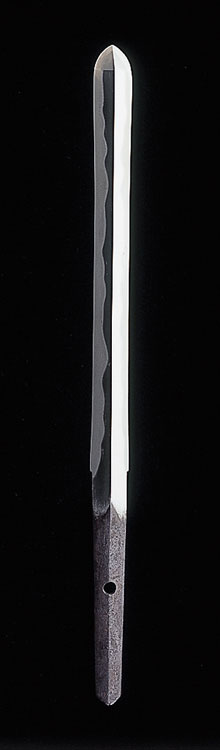 「宝寿」舞草。奥州平泉住。 このころから宝寿鍛冶で九州および大和に移住するものがあり、大和に移住した宝寿鍛冶には「大和国住塔本宝寿」銘の剣が残されている。 地鉄は板目に杢がまじり肌立って地沸がつき白気る気味がある。 この剣は、永正ころの作で、珍品である。